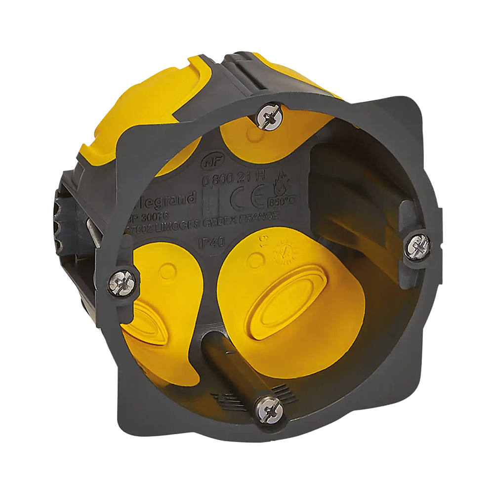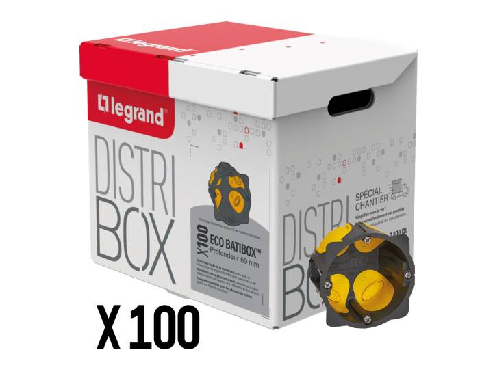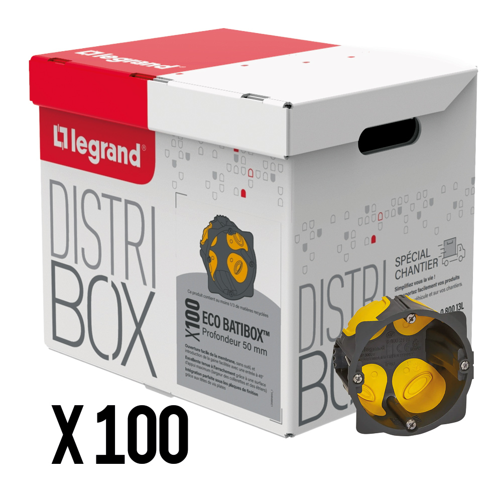 Distribox Legrand Eco Batibox 080013L : lot de 100 boîtes d’encastrement 1 poste pour cloisons sèches, profondeur 50 mm, Ø67. Idéal pour pose en série, volume de câblage confortable et entrées adaptées gaines/câbles.