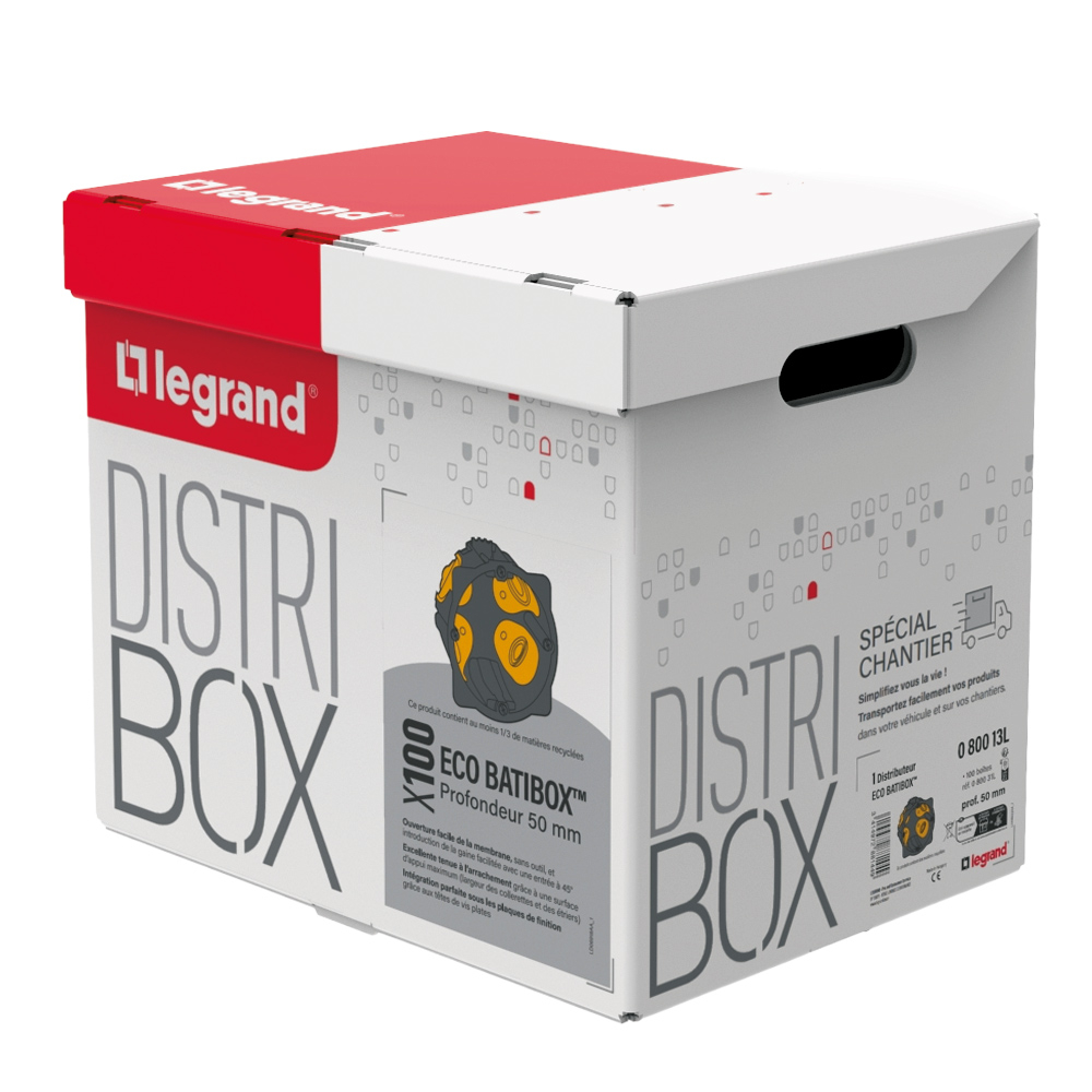 Le Distribox Eco Batibox Legrand 080013L est un distributeur de 100 boîtes d’encastrement 1 poste pour cloisons sèches, profondeur 50 mm, conçu pour poser vite et en série sur chantier, avec un format qui limite les ruptures et les manipulations.